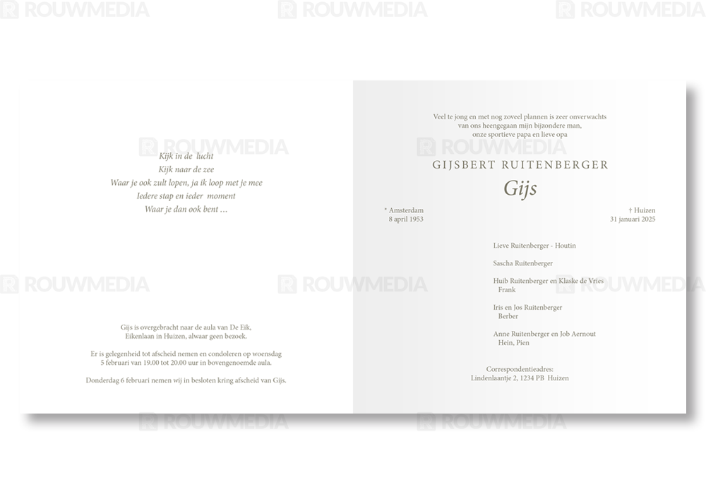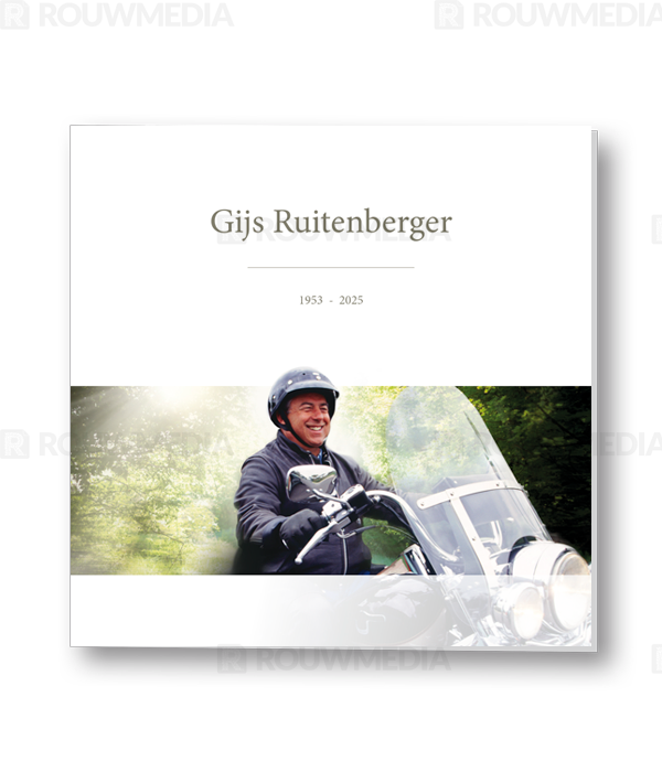 Bij deze vierkante rouwkaart heeft u de mogelijkheid om een eigen foto of portret weer te geven in een verticale balk. Boven de foto kunt u de naam en datums weergeven.