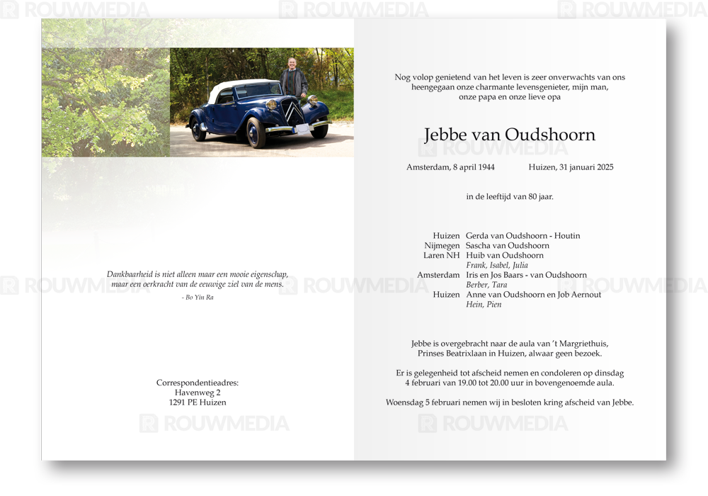 Bij deze rechthoekige rouwkaart heeft u de mogelijkheid om een eigen foto of portret weer te geven in een verticale balk. Boven de foto kunt u de naam en datums weergeven.