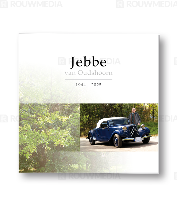 Bij deze vierkante rouwkaart heeft u de mogelijkheid om een eigen foto of portret weer te geven in een verticale balk. Boven de foto kunt u de naam en datums weergeven.