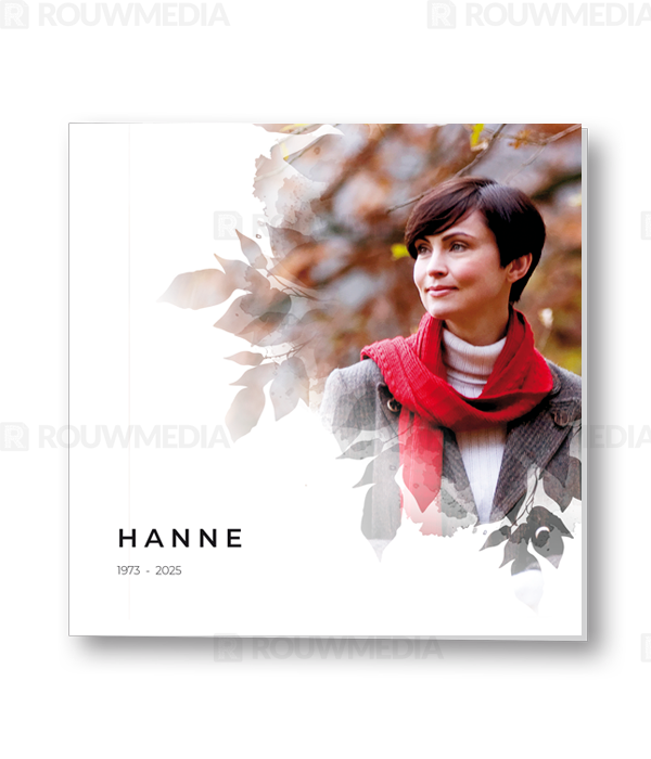 Bij deze rouwkaart heeft u de mogelijkheid om een eigen foto of portret weer te geven in een silhouette dat bestaat uit bladeren.