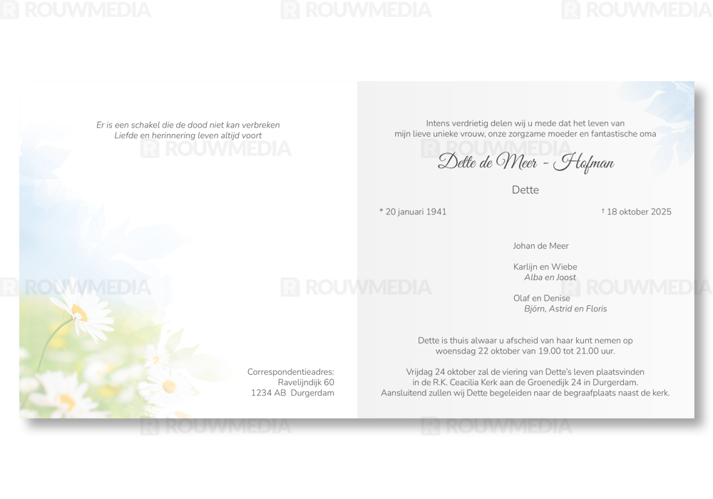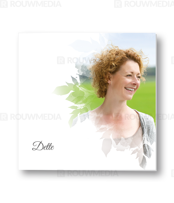 Bij deze rouwkaart heeft u de mogelijkheid om een eigen foto of portret weer te geven in een silhouette dat bestaat uit bladeren.