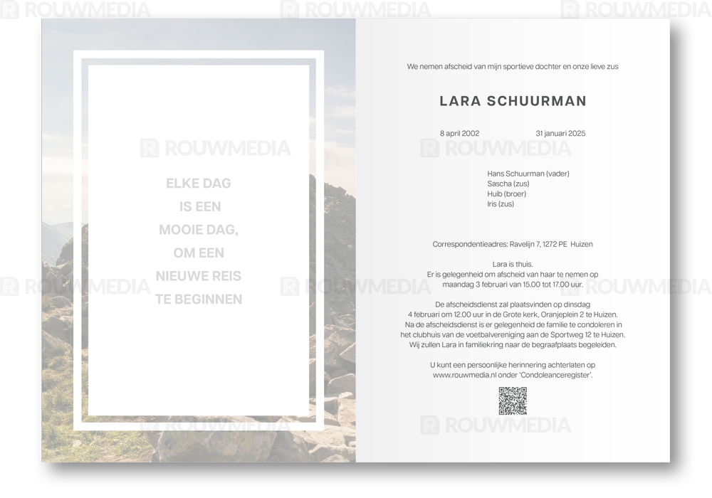 Op deze rouwkaart wordt een berglandschap weergegeven met daarop een kader met ruimte voor een eigen portretfoto.