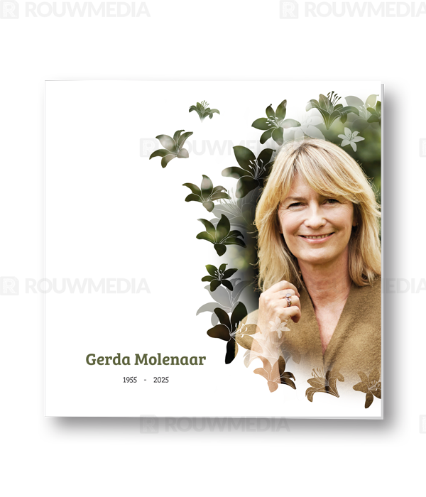 Bij deze rouwkaart heeft u de mogelijkheid om een eigen foto of portret weer te geven in een silhouette dat bestaat uit lelies.