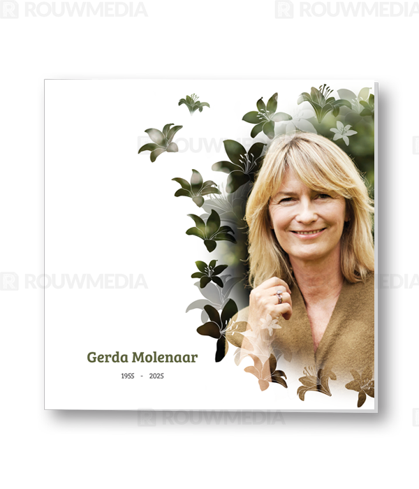 Bij deze rouwkaart heeft u de mogelijkheid om een eigen foto of portret weer te geven in een silhouette dat bestaat uit lelies.
