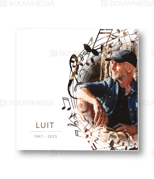 Bij deze rouwkaart heeft u de mogelijkheid om een eigen foto of portret weer te geven in een silhouette dat bestaat uit muzieknoten.