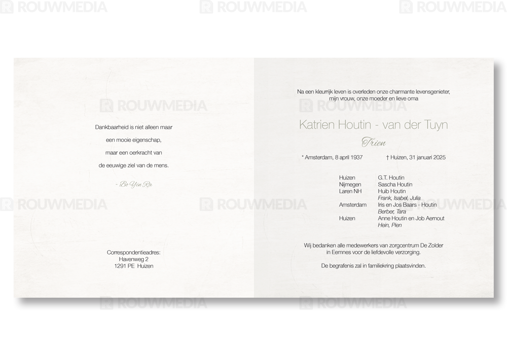 Bij deze vierkante rouwkaart heeft u de mogelijkheid om een eigen foto of portret weer te geven in retrostijl.