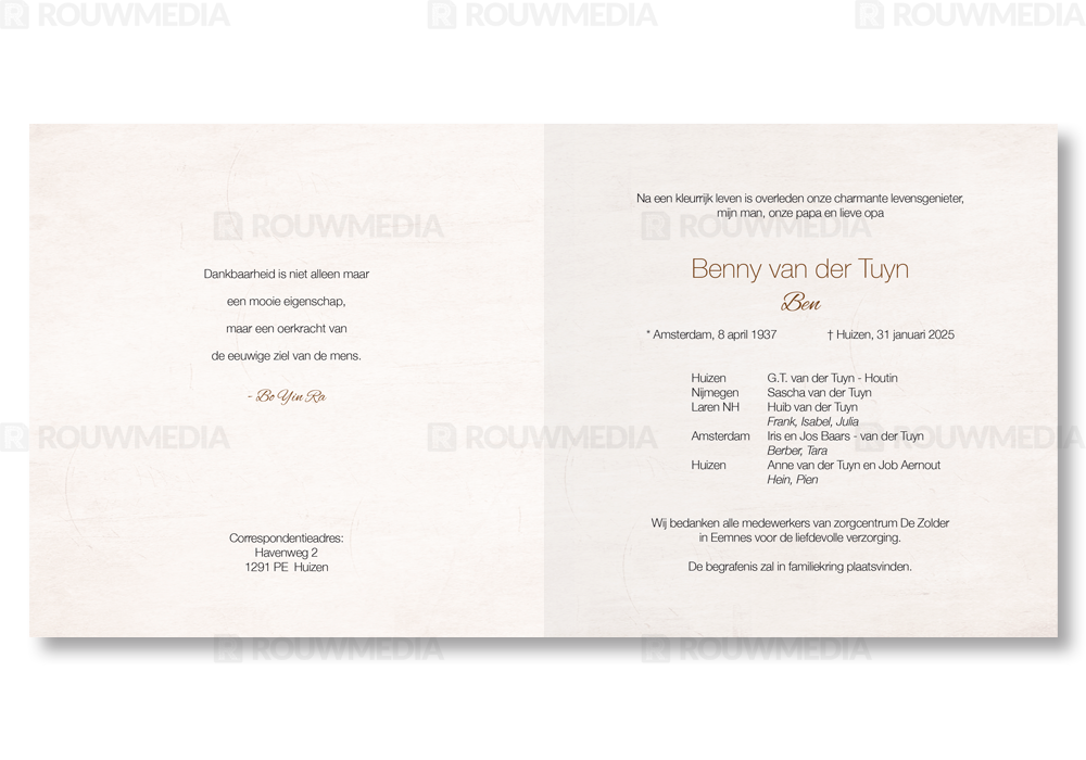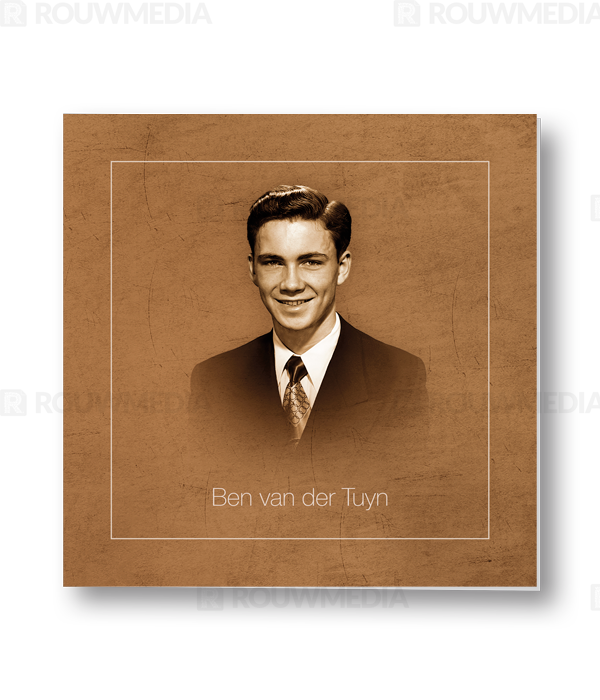 Bij deze vierkante rouwkaart heeft u de mogelijkheid om een eigen foto of portret weer te geven in retrostijl.