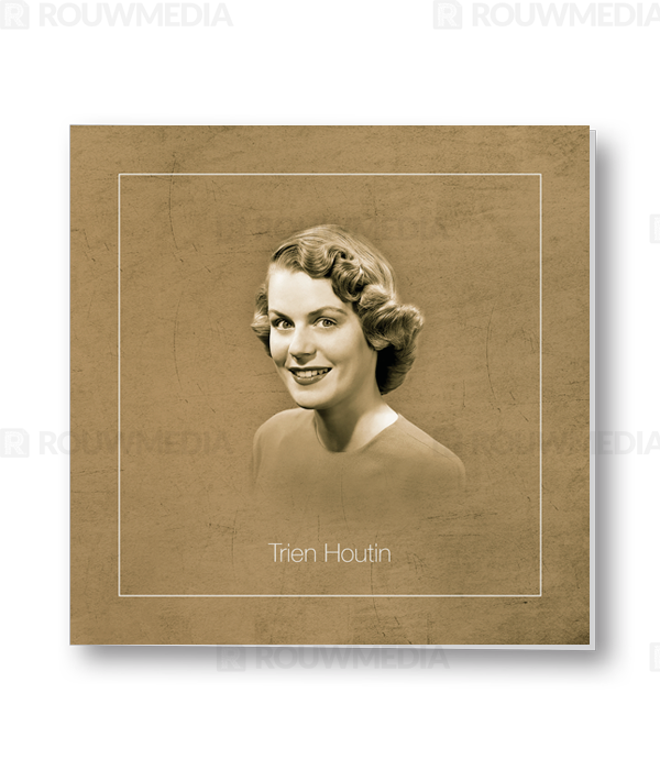 Bij deze vierkante rouwkaart heeft u de mogelijkheid om een eigen foto of portret weer te geven in retrostijl.