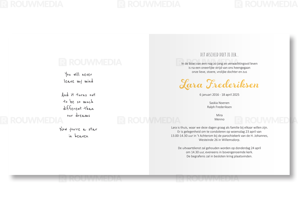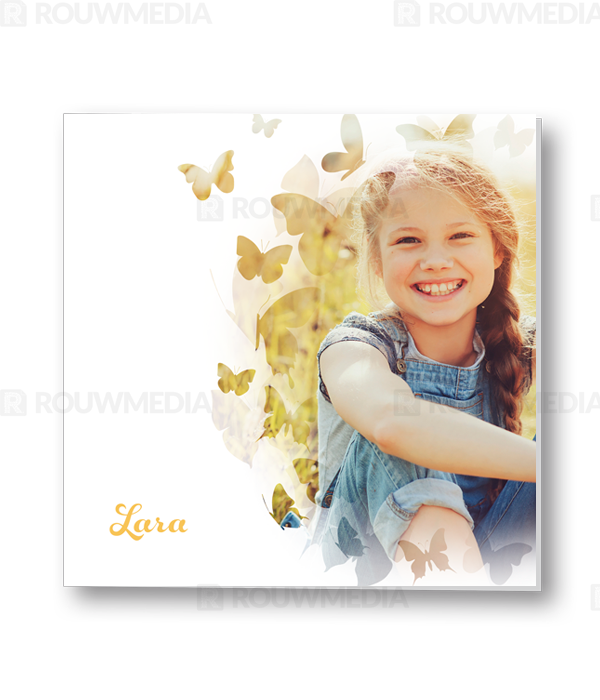 Bij deze rouwkaart heeft u de mogelijkheid om een eigen foto of portret weer te geven in een silhouette dat bestaat uit vlindertjes.