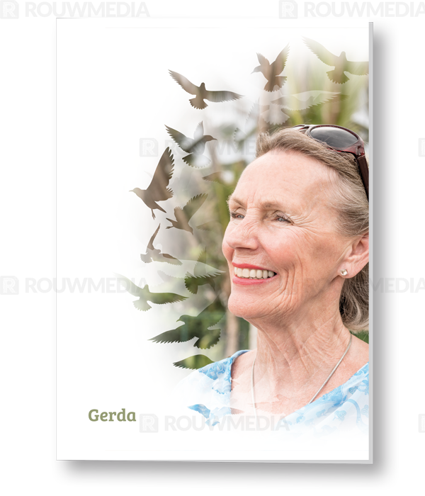 Bij deze staande rouwkaart heeft u de mogelijkheid om een eigen foto of portret weer te geven in een silhouette dat bestaat uit vogels.