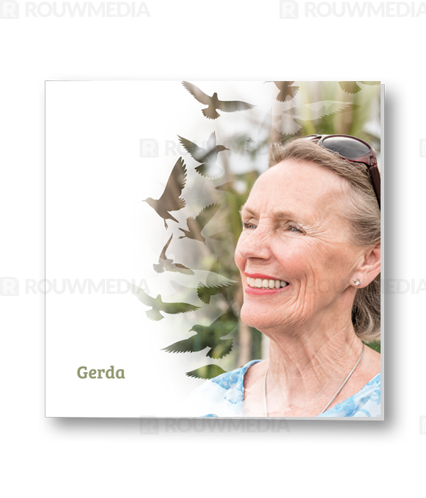 Bij deze rouwkaart heeft u de mogelijkheid om een eigen foto of portret weer te geven in een silhouette dat bestaat uit vogels.