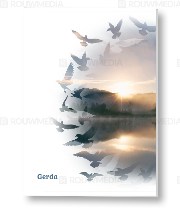 Bij deze staande rouwkaart heeft u de mogelijkheid om een eigen foto of portret weer te geven in een silhouette dat bestaat uit vogels.