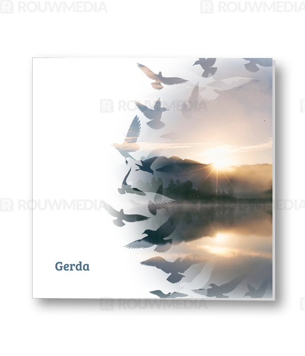 Bij deze rouwkaart heeft u de mogelijkheid om een eigen foto of portret weer te geven in een silhouette dat bestaat uit vogels.