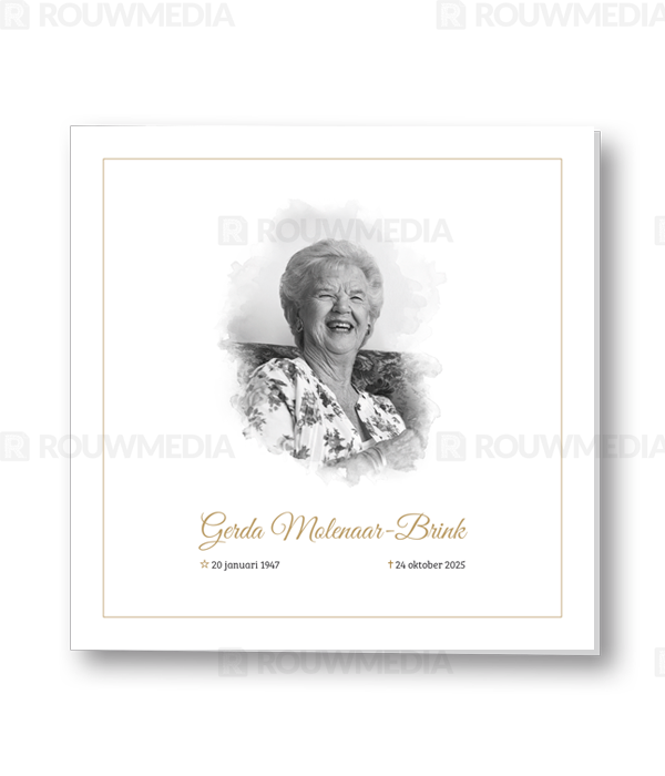 Bij deze rouwkaart heeft u de mogelijkheid om een eigen foto of portret weer te geven in een aquarel stijl.