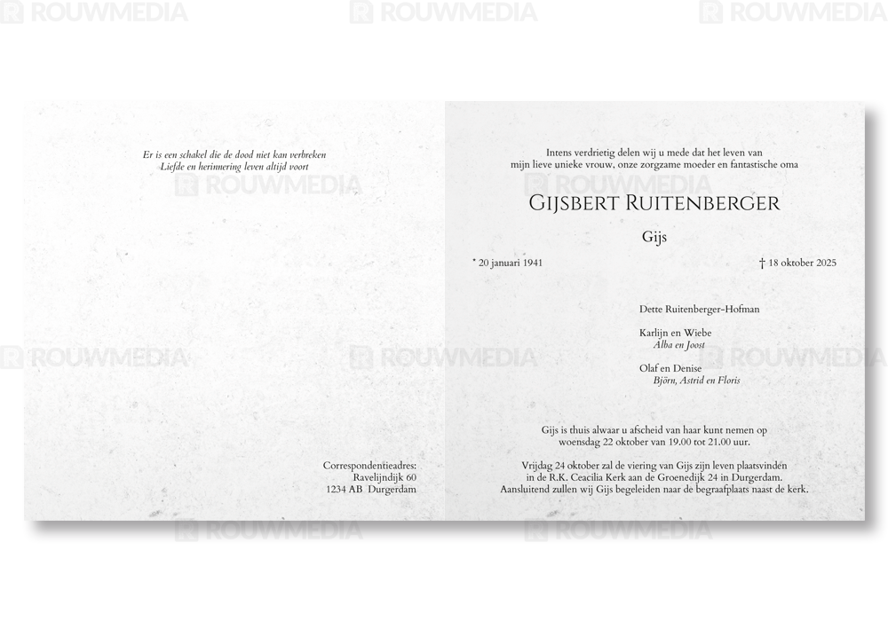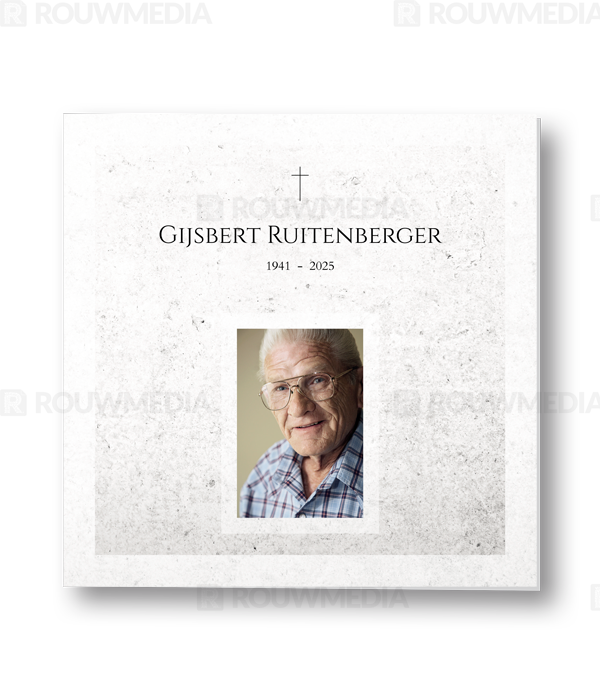 Voor deze vierkante rouwkaart kunt u een portret of afbeelding in het midden van de kaart weergeven. Deze afbeelding wordt geplaatst op een grijze abstracte achtergrond.