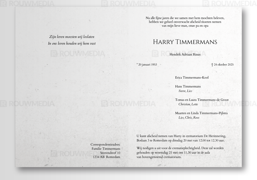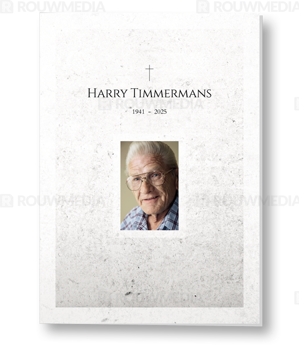 Voor deze staande rouwkaart kunt u een portret of afbeelding in het midden van de kaart weergeven. Deze afbeelding wordt geplaatst op een grijze abstracte achtergrond.