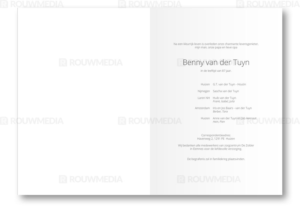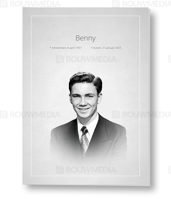 Bij deze staande rouwkaart heeft u de mogelijkheid om een eigen foto of portret weer te geven in zwart-wit stijl. De foto wordt weergegeven op een grijze achtergrond.