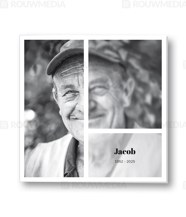 Rouwkaart met portretfoto omgeven door witte kaders