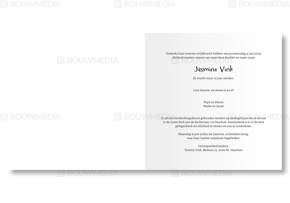 Rouwkaart met portretfoto omgeven door zwarte kaders