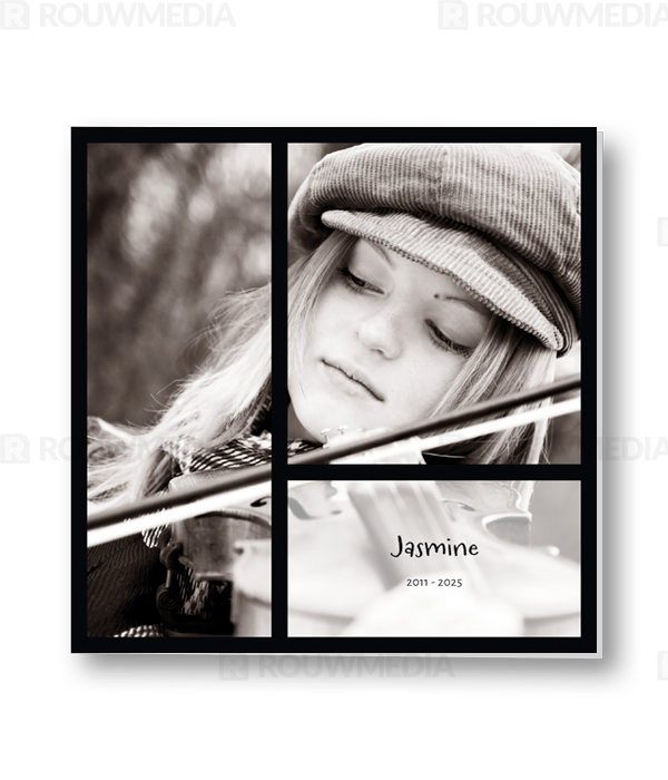 Op deze rouwkaart kunt u een eigen portretfoto plaatsen en worden hieromheen zwarte kaders geplaatst om de foto extra te benadrukken.