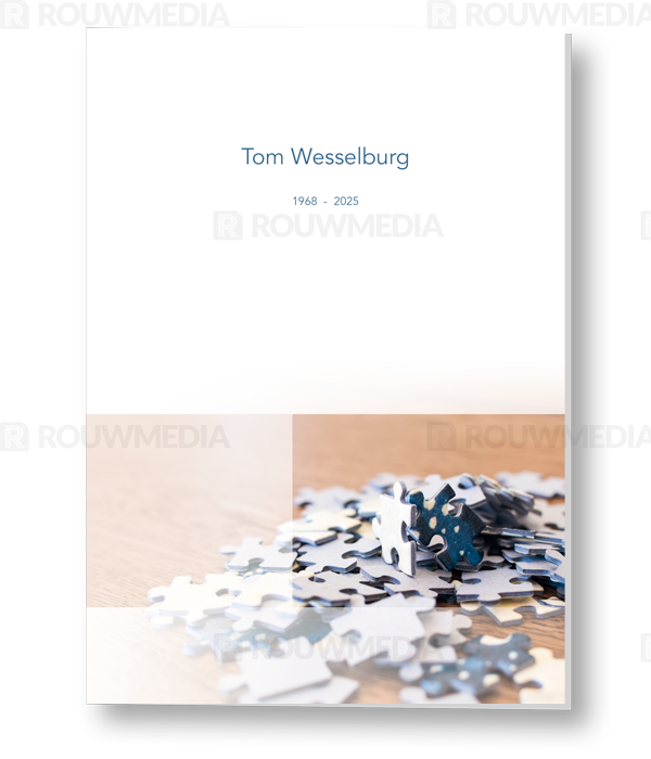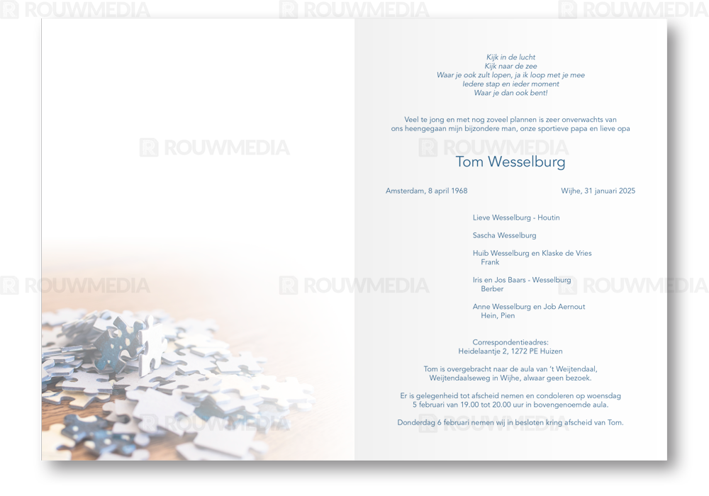 Op deze rouwkaart wordt een afbeelding van puzzelstukjes weergegeven, de foto wordt weergegeven met vervaagde vlakken.