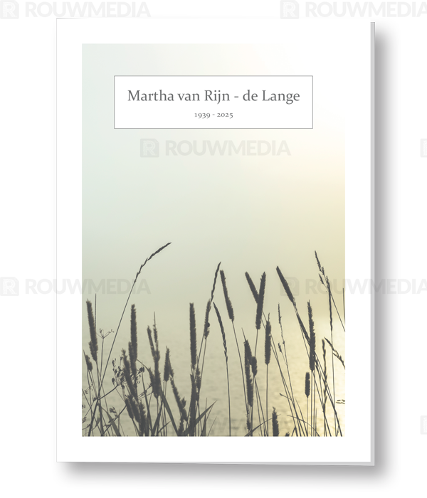 In de staande rouwkaart wordt een beeldvullende foto weergegeven van rietstruiken bij het water.