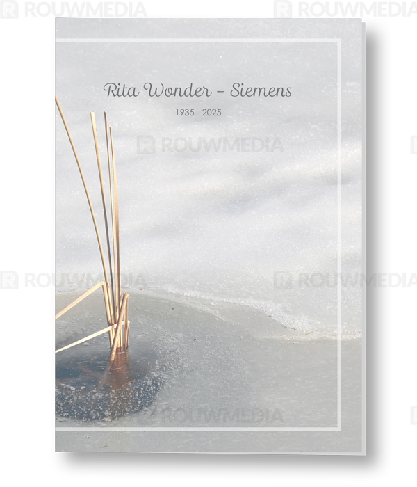 In de staande rouwkaart wordt een beeldvullende foto weergegeven van een takje riet dat bij zee staat.