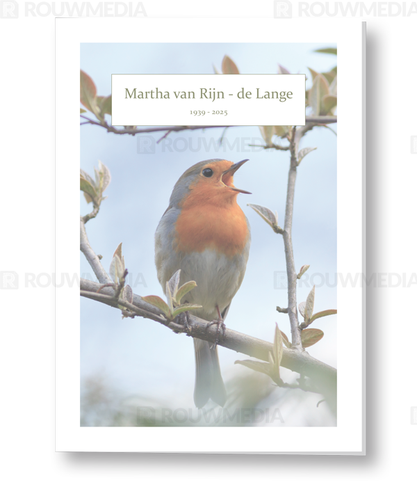 In de staande rouwkaart wordt een beeldvullende foto weergegeven van een zingend roostborstje.