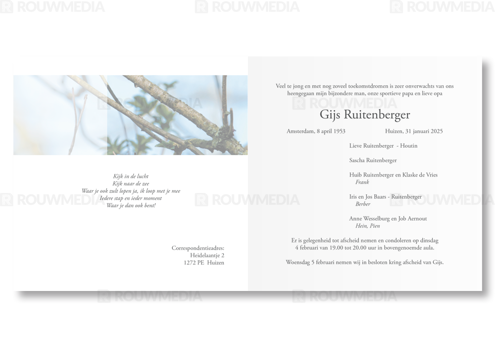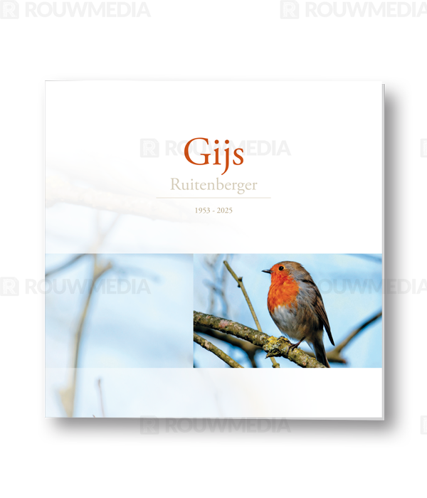 Op deze staande rouwkaart wordt een roodborstje weergegeven. Daarboven is het mogelijk om een naam met datums weer te geven.