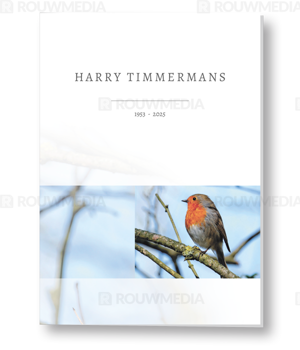 Op deze staande rouwkaart wordt een roodborstje weergegeven. Daarboven is het mogelijk om een naam met data weer te geven.