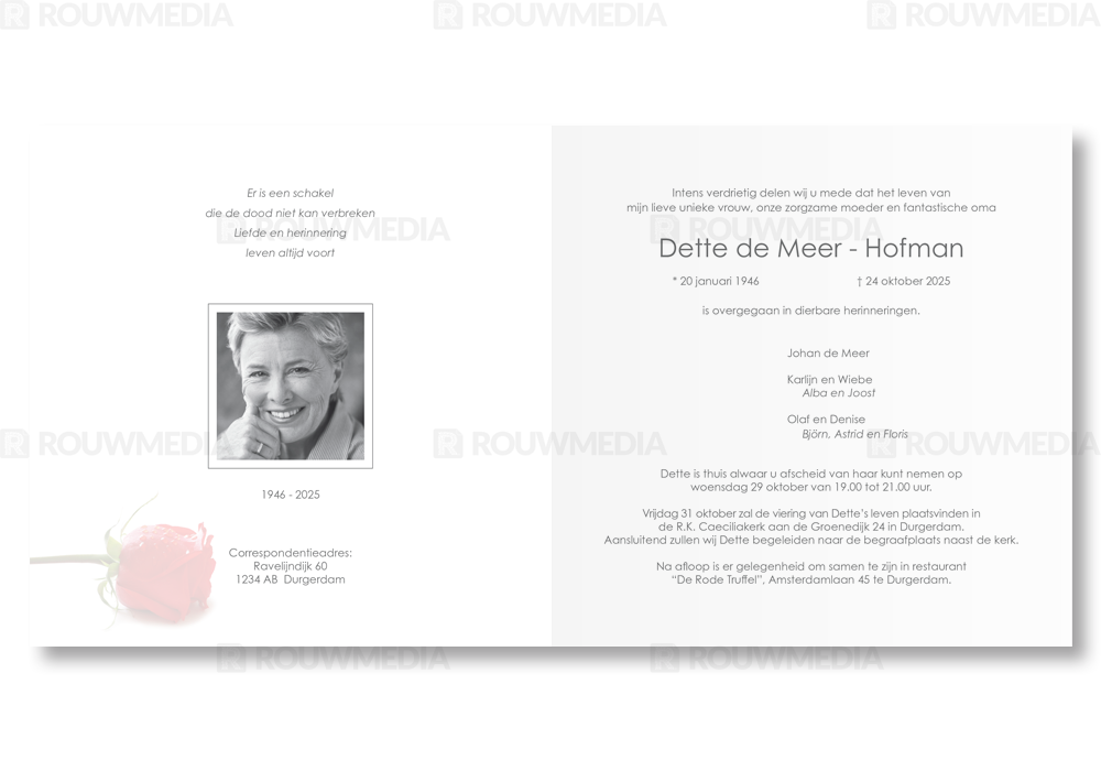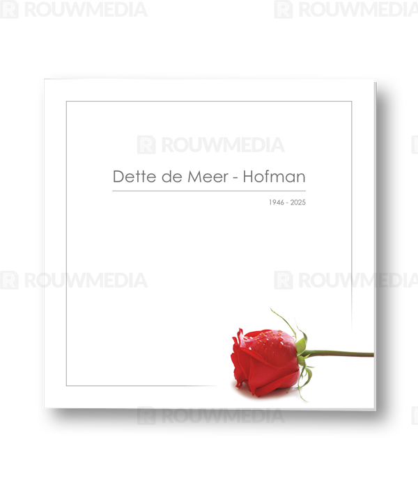 Deze vierkante rouwkaart toont in een simpele stijl hoe een afbeelding de focus kan krijgen in een kaart, maar wel de serene rust bewaart. Voor deze kaart is er gekozen voor een rode roos.