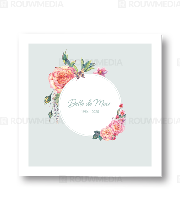 In deze vierkante rouwkaart wordt de naam en datums van de overledenen centraal gezet. Door een ronde cirkel met vleurige rozen wordt de naam extra geaccentueerd.