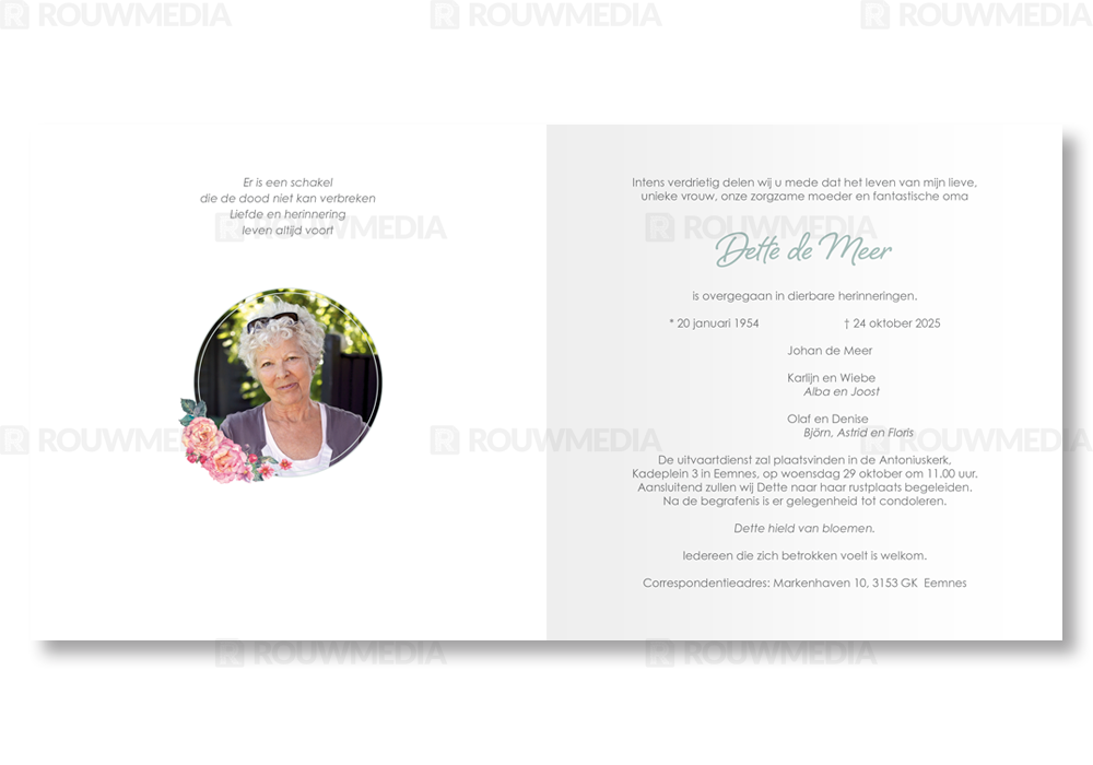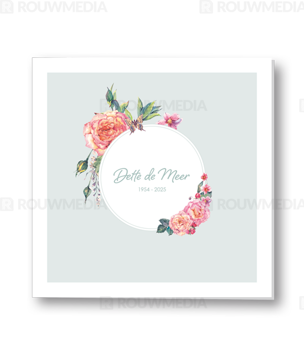 In deze vierkante rouwkaart wordt de naam en datums van de overledenen centraal gezet. Door een ronde cirkel met vleurige rozen wordt de naam extra geaccentueerd.