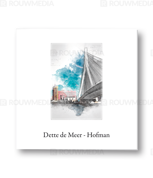 Deze rouwkaart maakt onderdeel uit van de reeks schets afbeeldingen. Op deze kaart wordt de Erasmusbrug van Rotterdam weergegeven. Onder de schets kan de naam en datums worden getoond.
