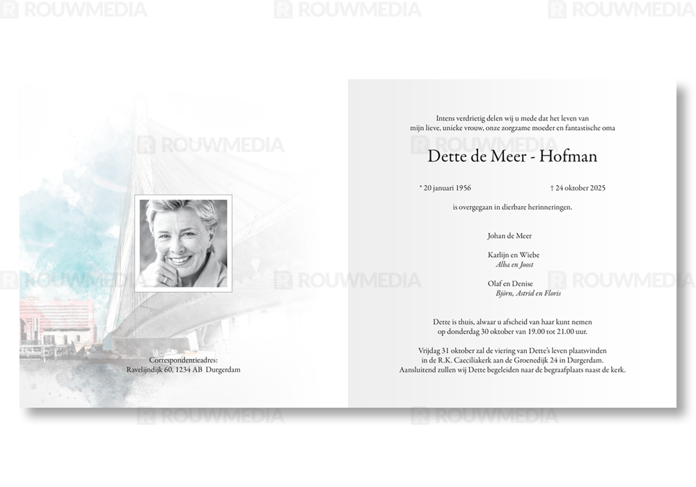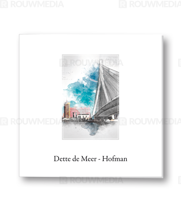 Deze rouwkaart maakt onderdeel uit van de reeks schets afbeeldingen. Op deze kaart wordt de Erasmusbrug van Rotterdam weergegeven. Onder de schets kan de naam en datums worden getoond.