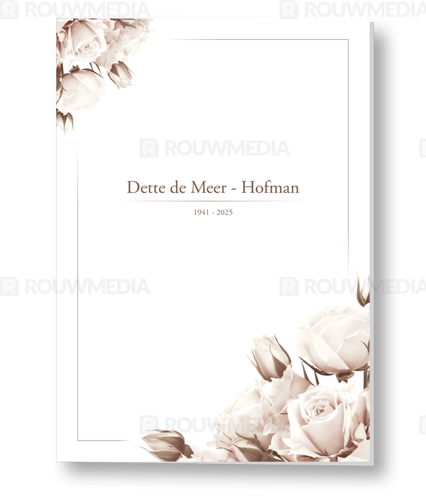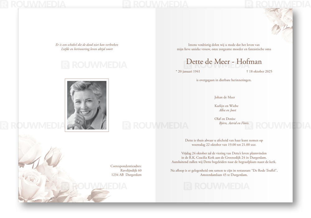 Deze rouwkaart toont in een simpele stijl hoe een afbeelding de focus kan krijgen in een kaart, maar wel de serene rust bewaart. Voor deze kaart is er gekozen voor witte rozen.