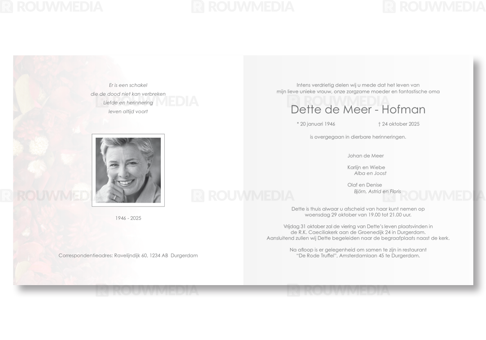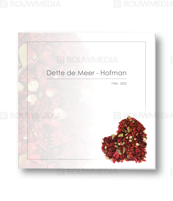 Deze vierkante rouwkaart toont in een simpele stijl hoe een afbeelding de focus kan krijgen in een kaart, maar wel de serene rust bewaart. Voor deze kaart is er gekozen voor een rozenhart.