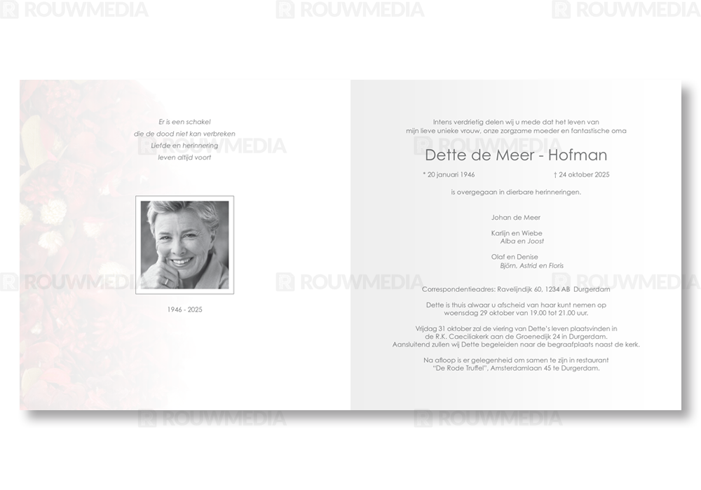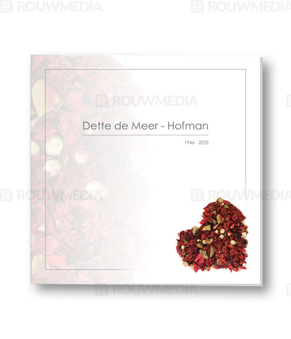 Deze vierkante rouwkaart toont in een simpele stijl hoe een afbeelding de focus kan krijgen in een kaart, maar wel de serene rust bewaart. Voor deze kaart is er gekozen voor een rozenhart.