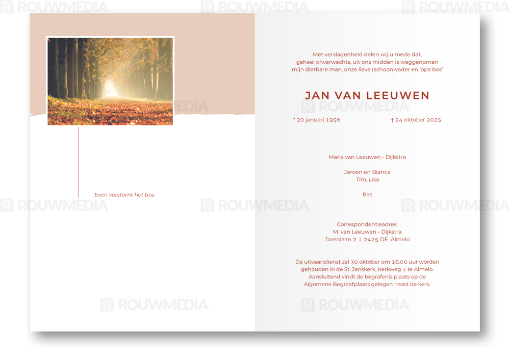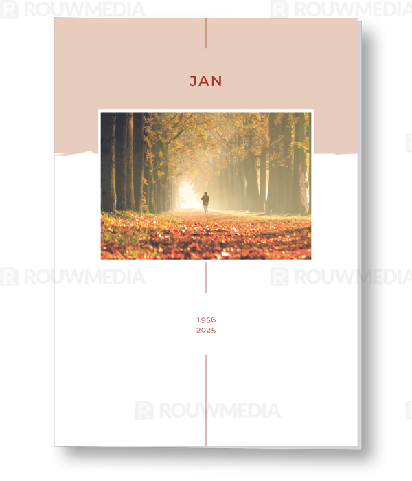 Op deze stijlvol vormgegeven rouwkaart met warme kleuren kunt u een eigen foto plaatsen op de voorzijde en aan de binnenzijde.
