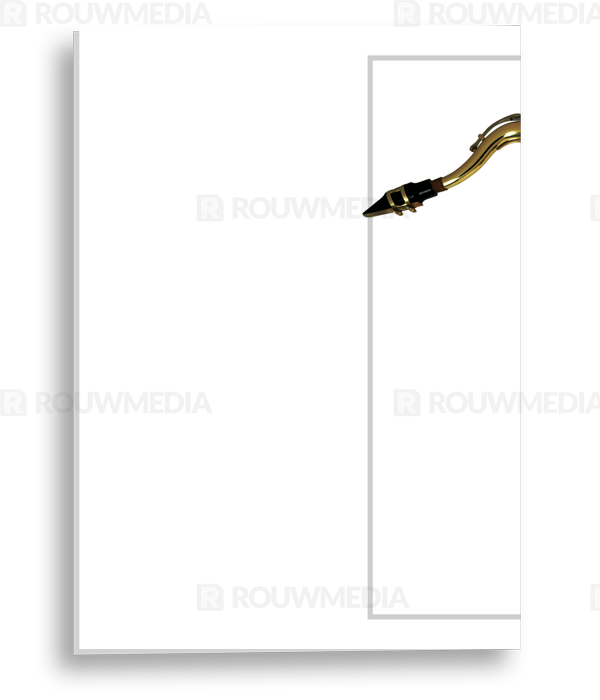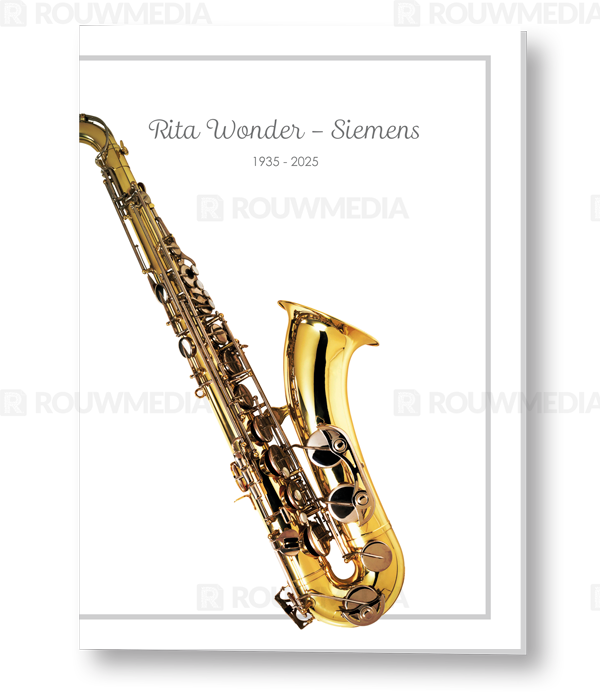 In de staande rouwkaart wordt een beeldvullende foto weergegeven van een saxofoon.