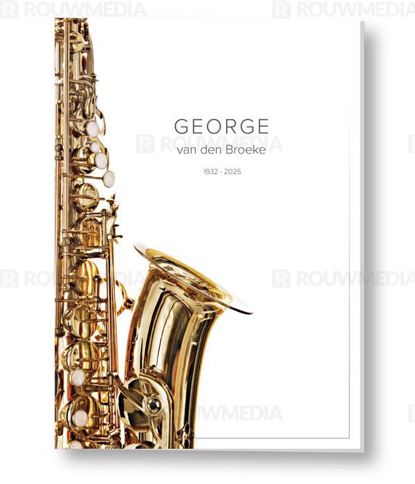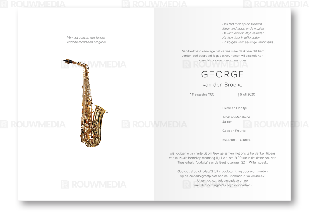 In deze staande rouwkaart wordt aan de linkerkant een afbeelding weergegeven van een saxofoon.