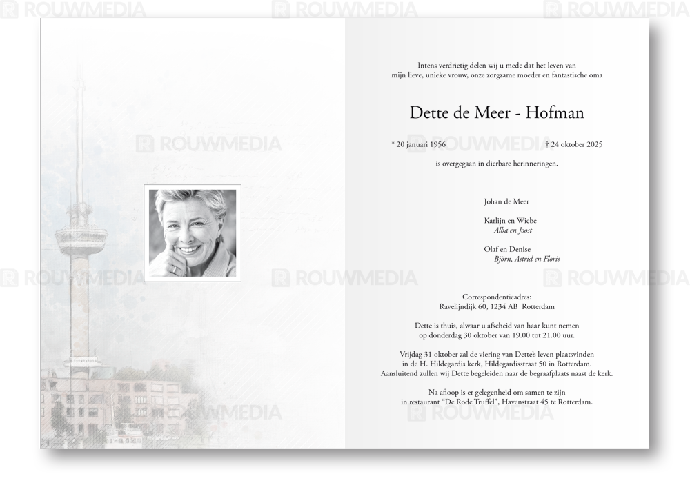 Rouwkaart met schets Rotterdam Euromast