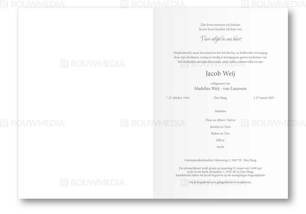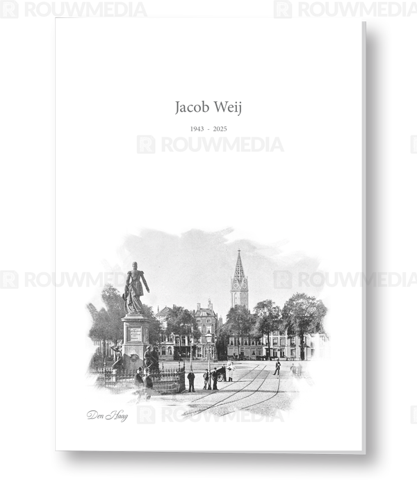 In deze recht staande kaart wordt een afbeelding weergegeven een schets van een plein in Den Haag. Daarnaast is het mogelijk om de naam, data en gedicht/citaat weer te geven.