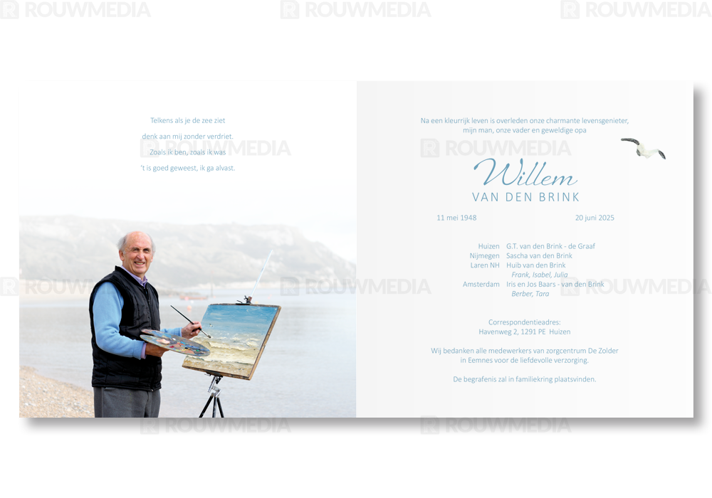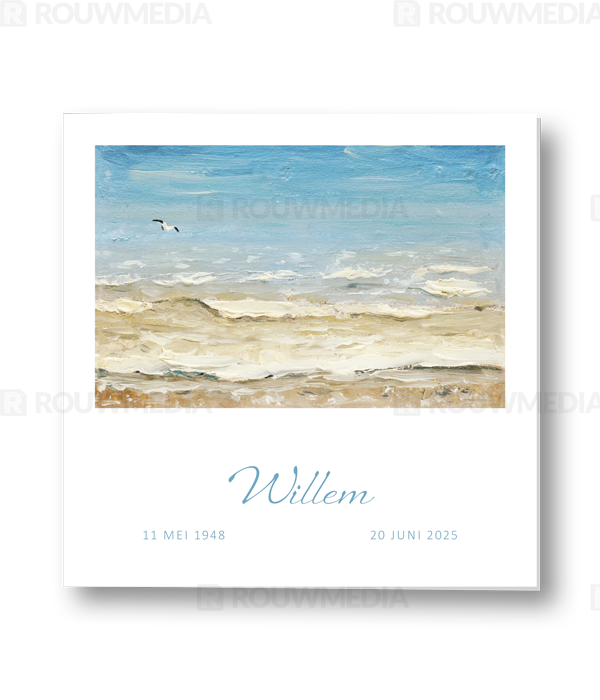 In deze vierkante rouwkaart kunt u een eigen gekozen schilderij weergeven met daaronder de naam en datums.