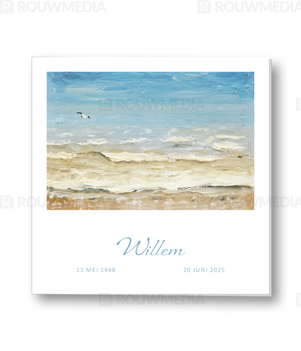 In deze vierkante rouwkaart kunt u een eigen gekozen schilderij weergeven met daaronder de naam en datums.