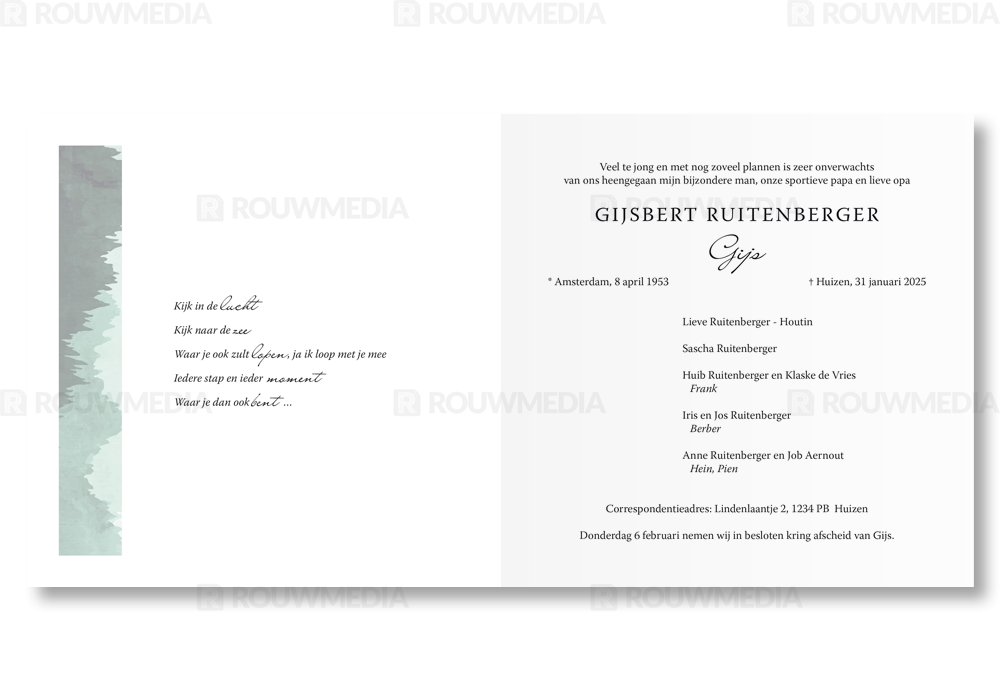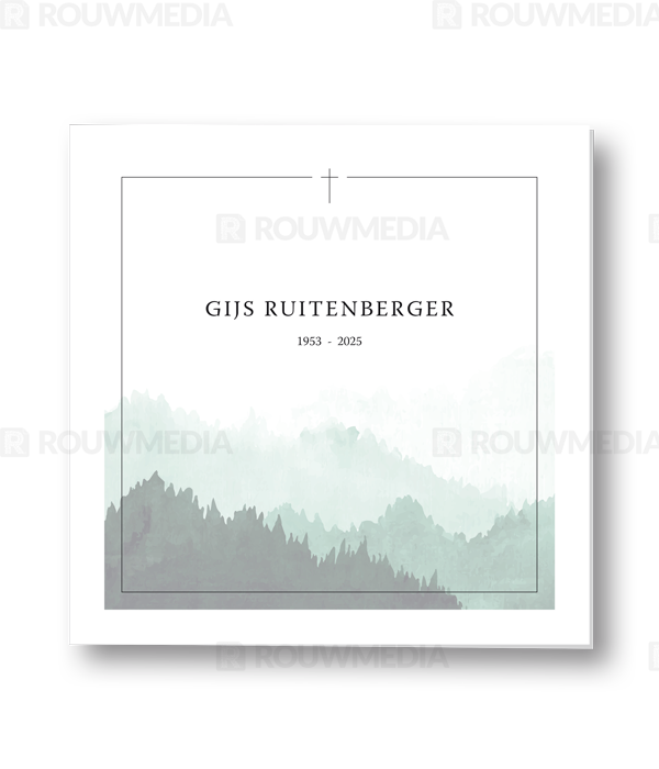 In deze vierkante rouwkaart is een aquarel met zwart/witte vlekken weergegeven. De focus binnen deze kaart ligt op de geschilderde/aquarel stijl. Daarnaast is het ook mogelijk om de naam en datums te tonen.