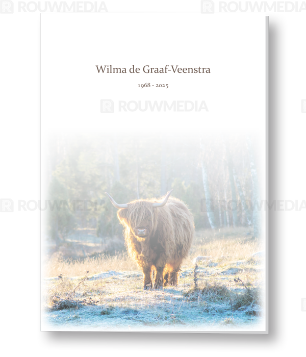 In deze staande rouwkaart wordt een beeldvullende afbeelding weergegeven van een Schotse hooglander rund. Boven de afbeelding kunt u de naam en datums weergeven.
