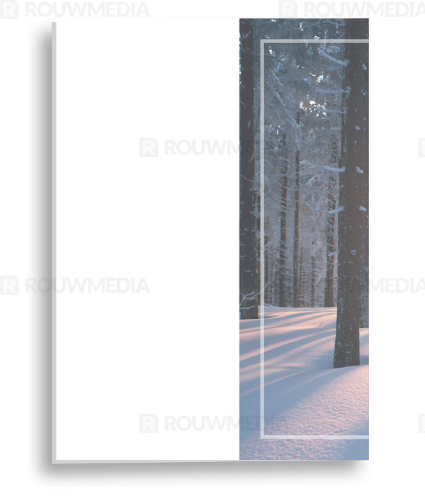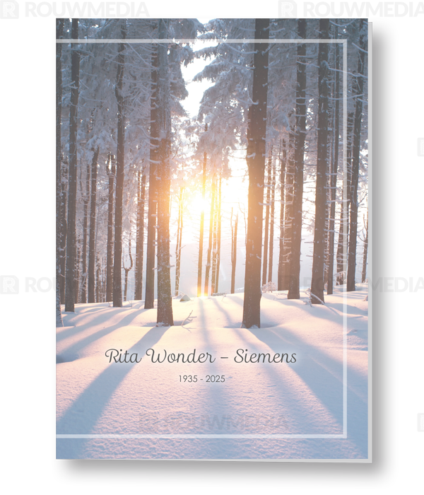 In de staande rouwkaart wordt een beeldvullende foto weergegeven van winters bos waar de zon aan het opkomen is.