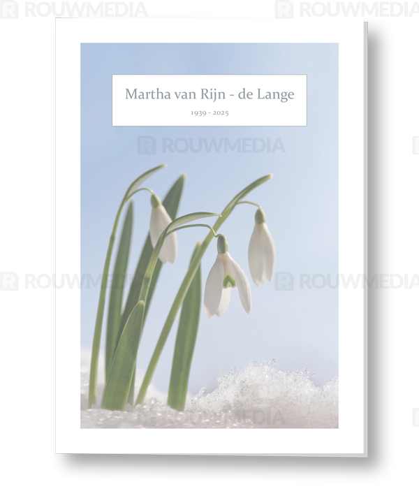 In de staande rouwkaart wordt een beeldvullende foto weergegeven van een sneeuwklokje.