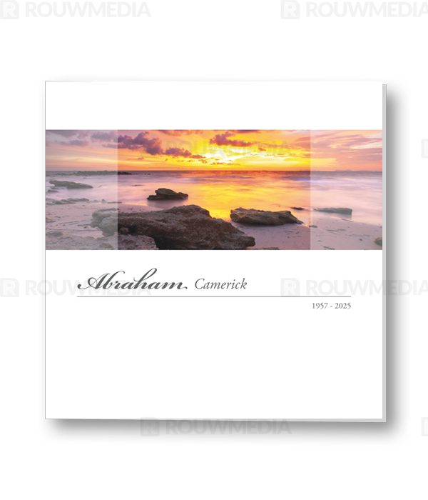 In deze vierkante rouwkaart wordt een horizontale afbeelding weergegeven van een ondergaande zon in de zee met stenen op het strand.